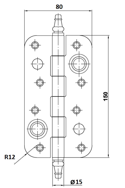 Bisagra de seguridad antipalanca, medidas de 150x80mm, de canto redondo, con remate y sin rodamientos y resistente al fuego.