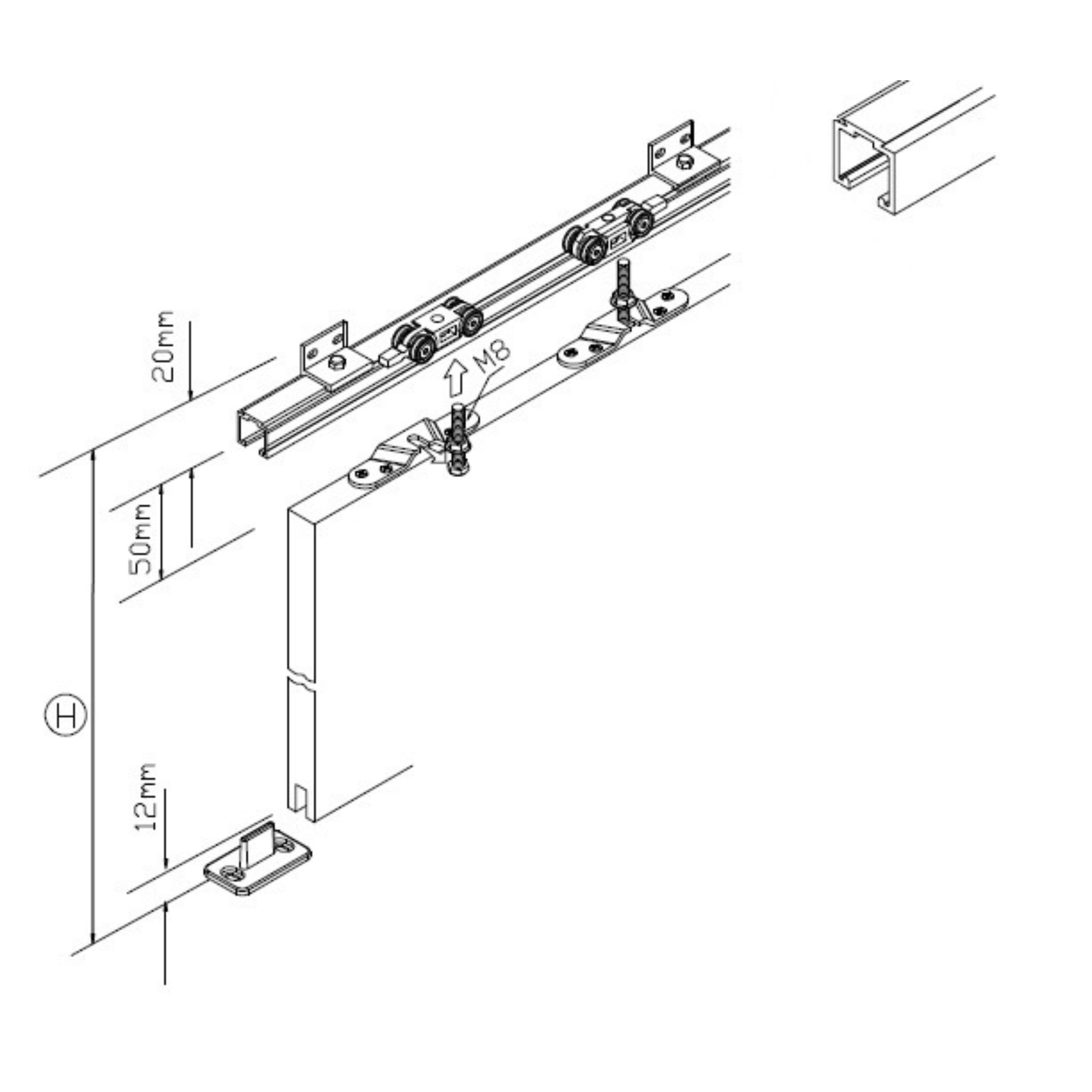 Fijación firme y segura: el sistema integra la puerta y los carros mediante tornillería M8 y tirafondos.