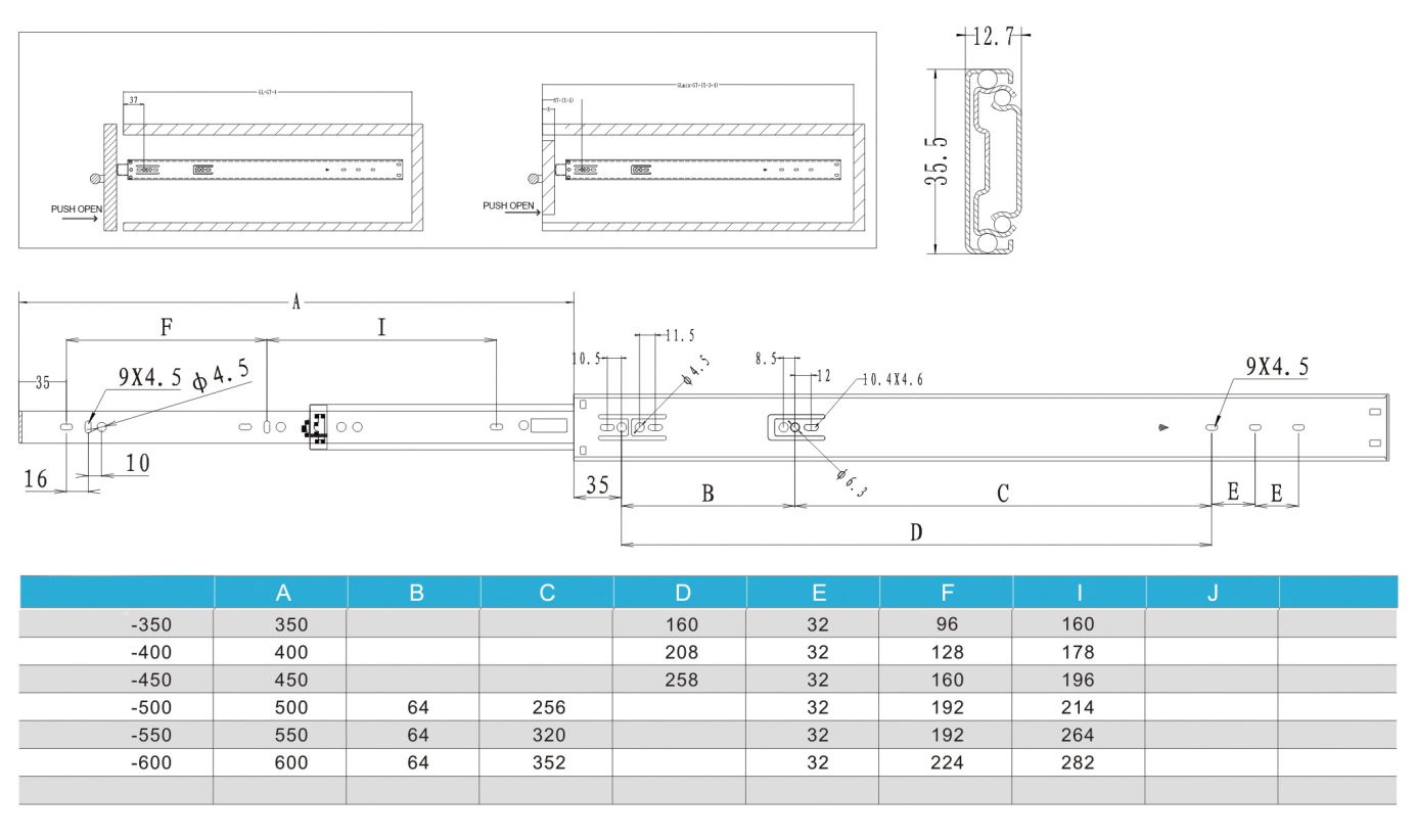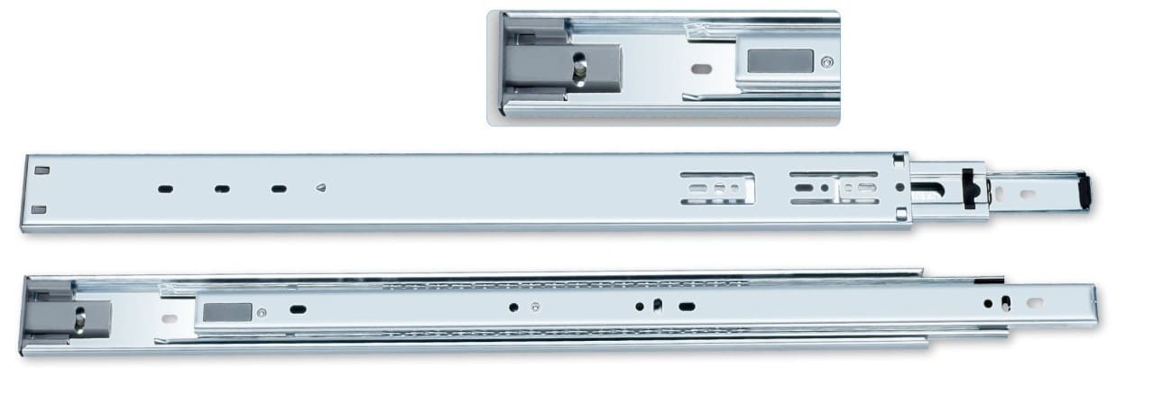 Guía telescópica de extracción total, con rodamientos de 45mm de ancho. Capacidad de 30kgs.